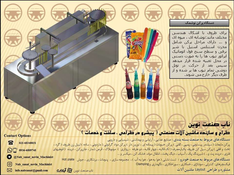 برای ظروف با اشکال هندسی مختلف مانند:نوشابه ای ، میوه ای و … دارای مراحل پرکن شامل مخزن استنلس استیل با شیر برقی و سطح سنج فول اتوماتیک اپراتور تیوب ها را به صورت دستی در محل تعبیه شده قرار میدهد سپس بعد از حرکت در تونل دوشی تمام تیوب ها پر شده و از طرف دیگر خارج می شوند. برای توضیحات بیشتر به لینک وبسایت به آدرسhttp://www.naabsanat.com مراجعه کنید و همچنین میتوانید در اینستاگرام با ما در ارتباط باشید instagram.com/nab_sanat_novin_machinist شماره تماس 09366509745