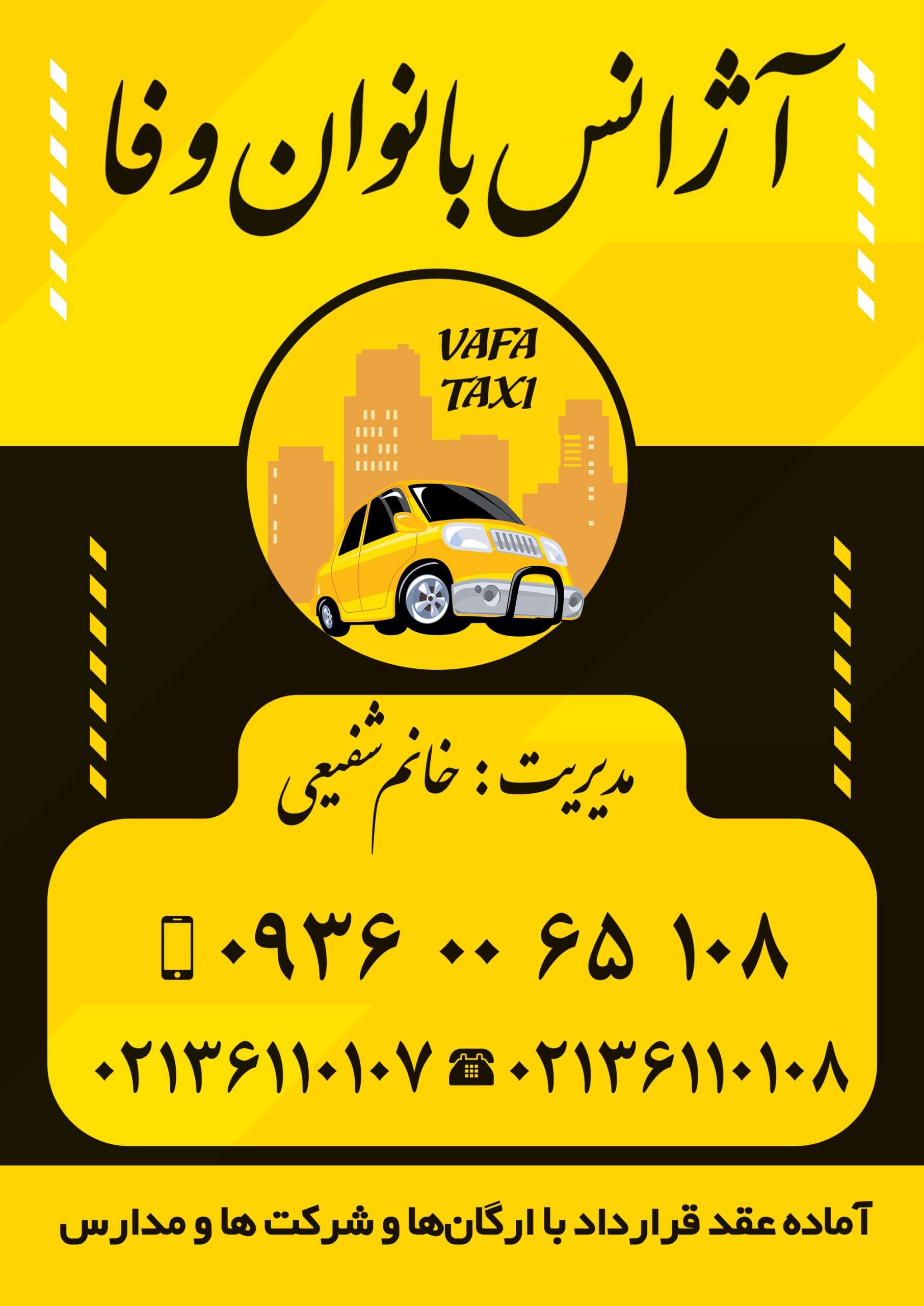 اژانس بانوان وفا قرچک بیش از ۱۵ سال تجربه سعی دارد با رانندگان با تجربه و مورد اطمینان خود در راستای خدمت رسانی به بانوان و کودکان و افراد مسن و تمامی خدمات حمل و نقل در کل مناطق قرچک و تهران برون شهری و شهری در خدمت شما عزیزان باشد.